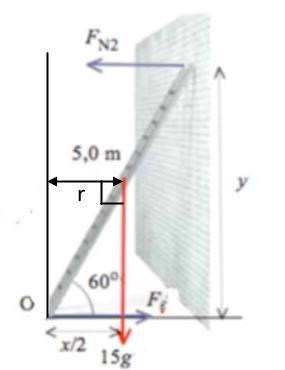 Jag har svårt att se det här med momentarm, jag kom fram till x=4,33 m och y=2,5 m. Jag har alltså kommit fram till samma värden men att momentarmarna tillhör motsatta krafter. Jag tänker mig att stegen är hypotenusan och komposanterna är momenarmen för respektive moment, så FN2 har 2,5 m som momentarm medan 15g har 4,33 m som momentarm (alltså motsatsen till vad lösningen). Dessutom har de halverat x vilket jag inte förstår varför.