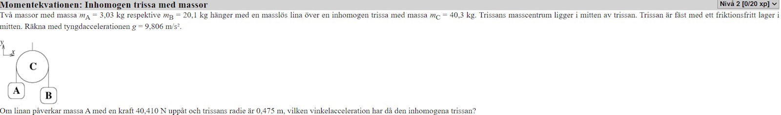 för att sedan lösa ut accelerationen. men jag har kört fast på hur jag ska få fram masströghetsmomentet på trissan eftersom den inte är homogen.