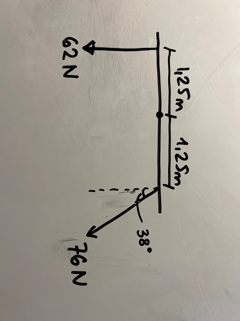 Den högra kraften ger upphov till ett medurs moment runt pricken på 1,25*76*cos(38) Nm = 74,9 Nm