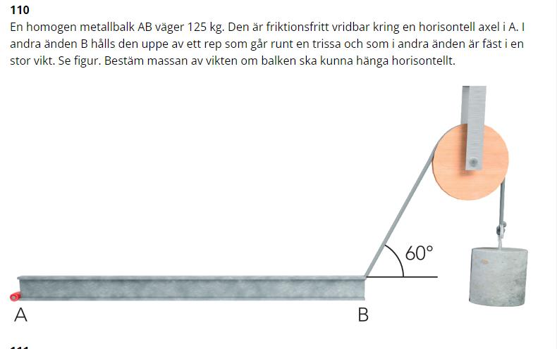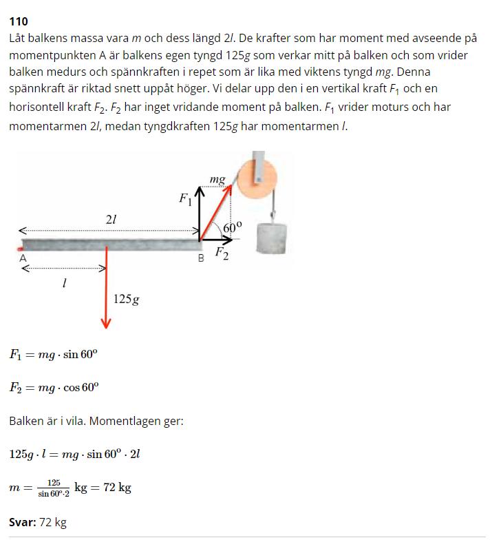 Jag fick också fram svaret 72 kg som viktens vikt för att uppnå momentjämvikt. Men när jag sedan ska räkna ut kraftjämvikt så blir det inte Fnet=0. Då har jag en fg kraft på bjälken på 125 g =1227 kg och uppåtriktade kraften är sin60*spänningskraft i snöre * g. Det får jag till sin 60*72g*g=6012. Det är ju inte alls kraftjämvikt