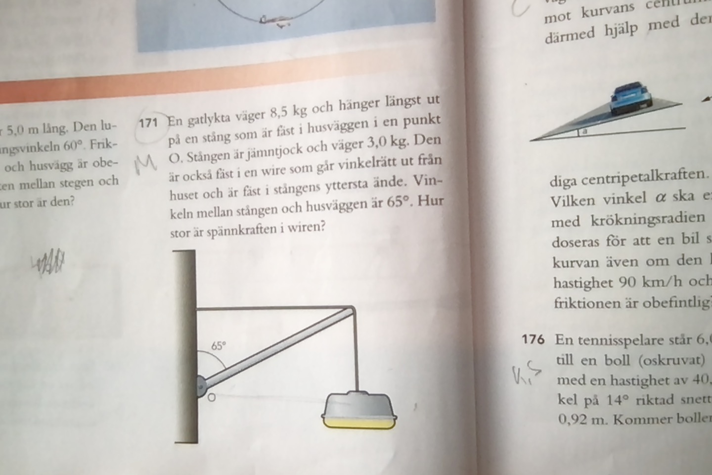 Kan någon förklara hur jag ska tänka på uppgift 171, jag fattar hur jag ska rita ut lampan och stångens vikter och moment men inte wiren.