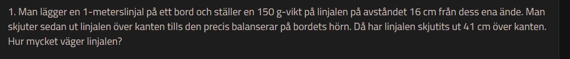 jaha är det så man gör då blir ju (0.150kg)⋅(0.25m)=m2⋅(0.41m)? om jag inte tänker fel eller är det 0,5 istället för 0,41? för det är ju ändå avståndet till balanspunkten
