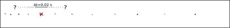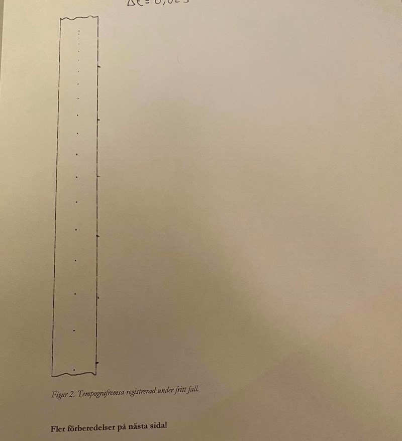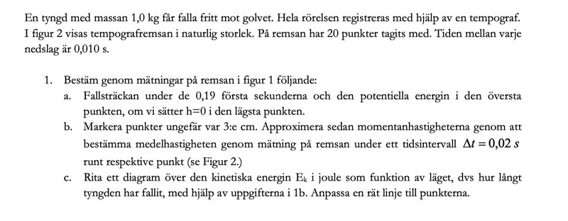 Sätt kryss på var 3:e cm på remsan (om det går så kan du försöka välja dina kryss så att de ligger på punkterna). Sen ska du beräkna ungefär hur fort tyngden faller vid varje kryss. Det är detta som de kallar för momentanhastigheten. Momentanhastigheten ska approximeras genom att ta en medelhastighet under 0,02 s runt varje kryss. Hur långt sträcka på remsan motsvarar 0,02 s vid t.ex. första krysset? Det behöver du ta reda på (=mäta). Då har du en fallsträcka och en tid. Då är det enkelt att räkna ut en medelhastighet vid första krysset.