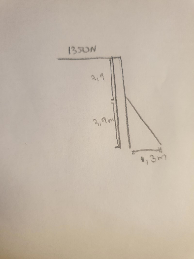 Ett stav balanseras av två linor, det ena är rätvinklig till staven och spänns med F=1340N, den andra spänns under en vinkel. Staven väger 310kg