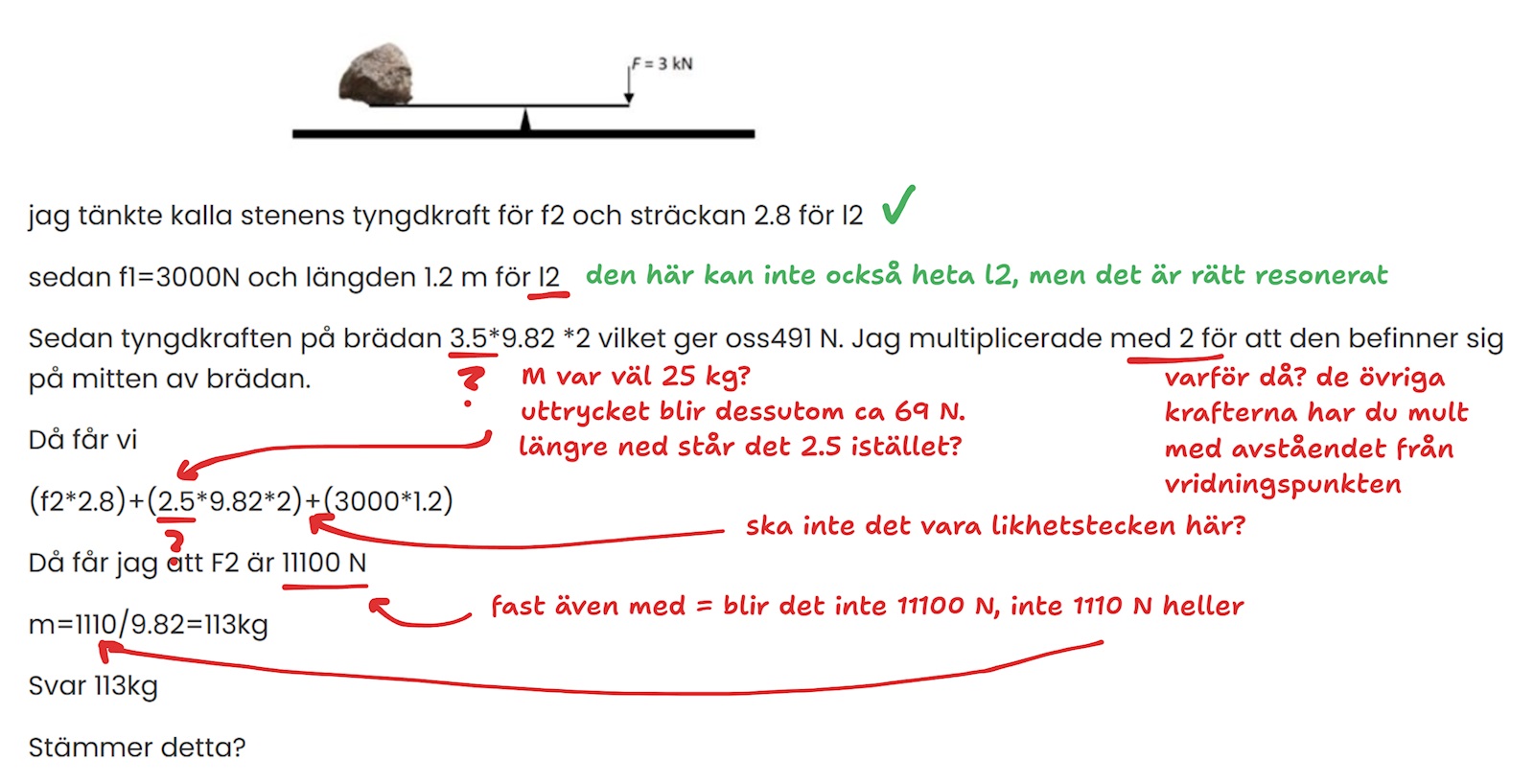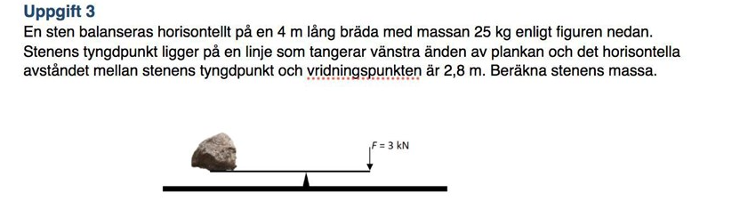 På brädan verkar också tyngdkraft som kommer att bidra till ett av momenten. Här sätter du avståndet godtyckligt till 2? Ja, brädans tyngdpunkt är i mitten av den, två meter från vardera änden. Men hur förhåller sig tyngdpunkten från vridningspunkten?