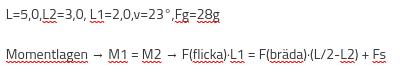 Tänkte att jämvikt råder och att momentlagen då gäller. Men kan inte förstå hur jag ska beräkna det hela då jag inte vet brädans massa, vilken jag tänker att jag måste veta eftersom dess tyngdpunkt är förskjuten relativt vridningsaxeln.