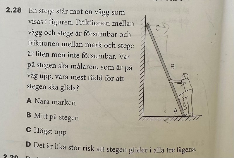 Jag förstår inte hur man ska tänka på den här uppgiften, svaret är C, men jag trodde det var A eftersom ju längre ner desto längre momentarm —> större moment