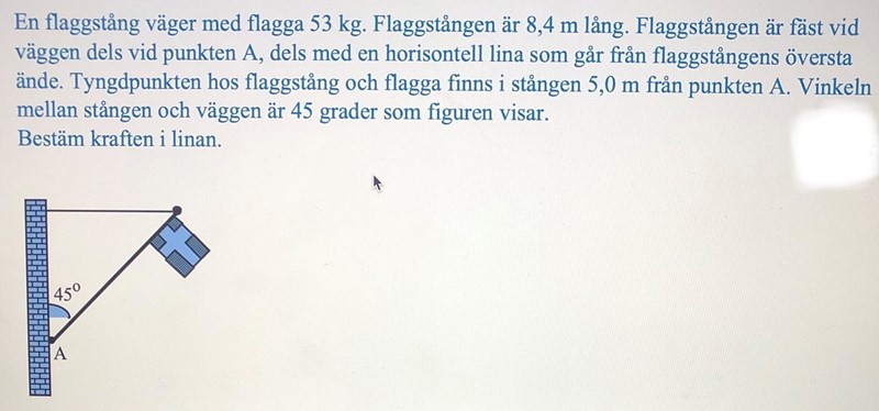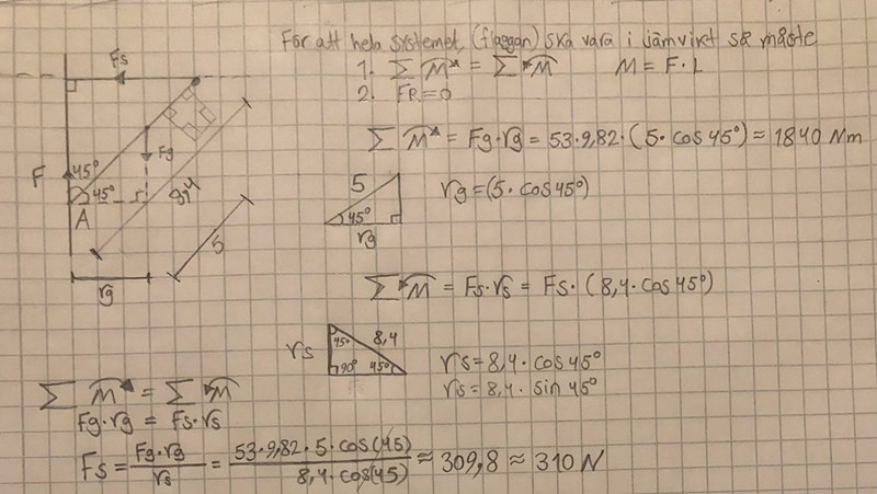 Förbättringar skulle kunna vara att du beskriver kring vilken axel du summerar vridmomentet kring, och att du ritar ut rs i figuren.
