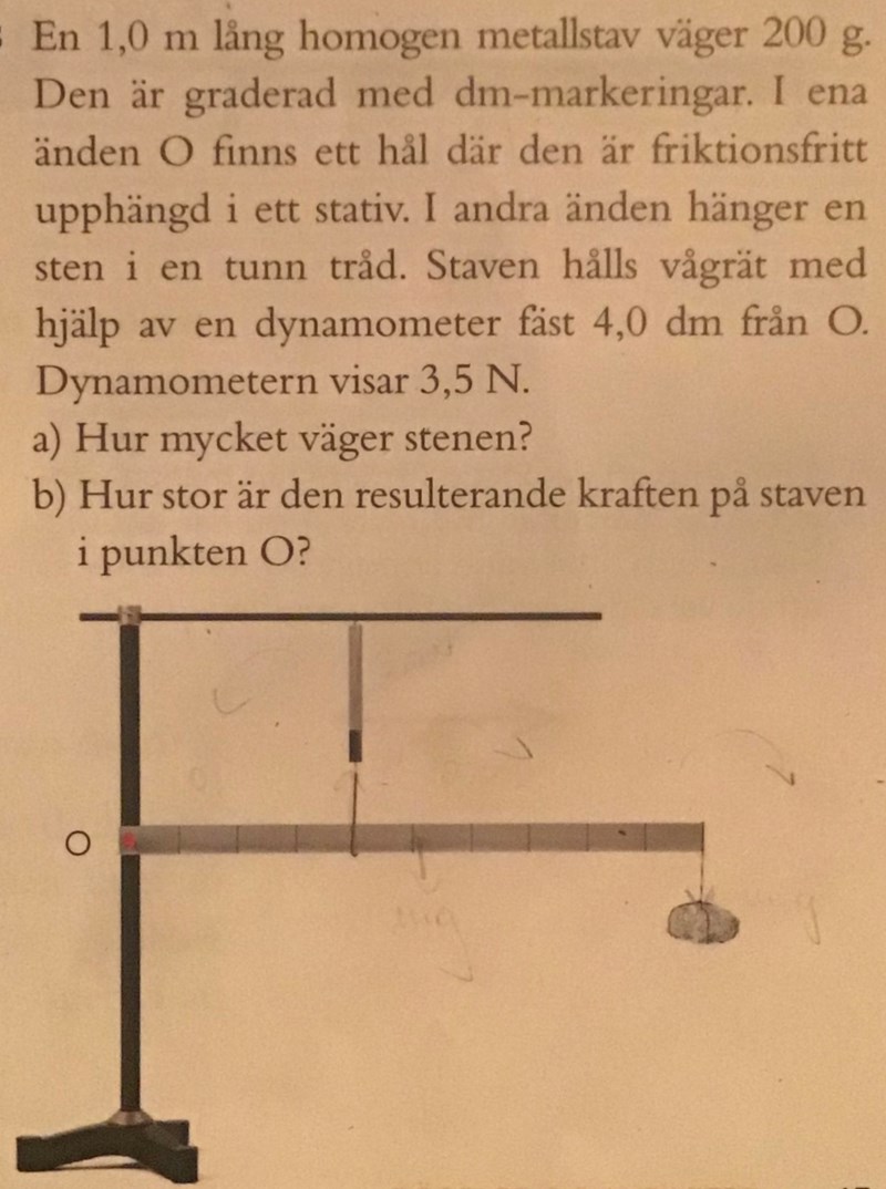 Jag har lösningen till uppgiften men jag förstår inte riktigt den. Det står att O är momentpunkten, men kan det också vara andra änden på staven där stenen finns? Staven vrider medurs vilket jag antar beror på att det finns en vikt och därmed en tyngd som drar den nedåt. Men hur kommer det sig att dynamometern vrider moturs? Den är ju fäst vinkelrät?