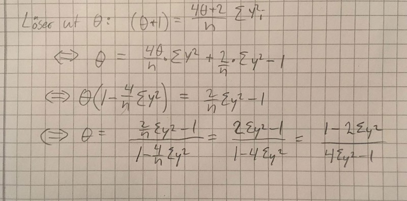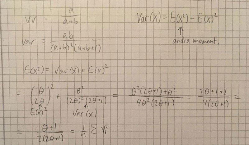 Finns det en lösning? Moment går väl ut på att sätta väntevärdet lika med medelvärdet och lösa ut θ? Μen väntevärdet av (θ,θ) blir ju bara 1/2?