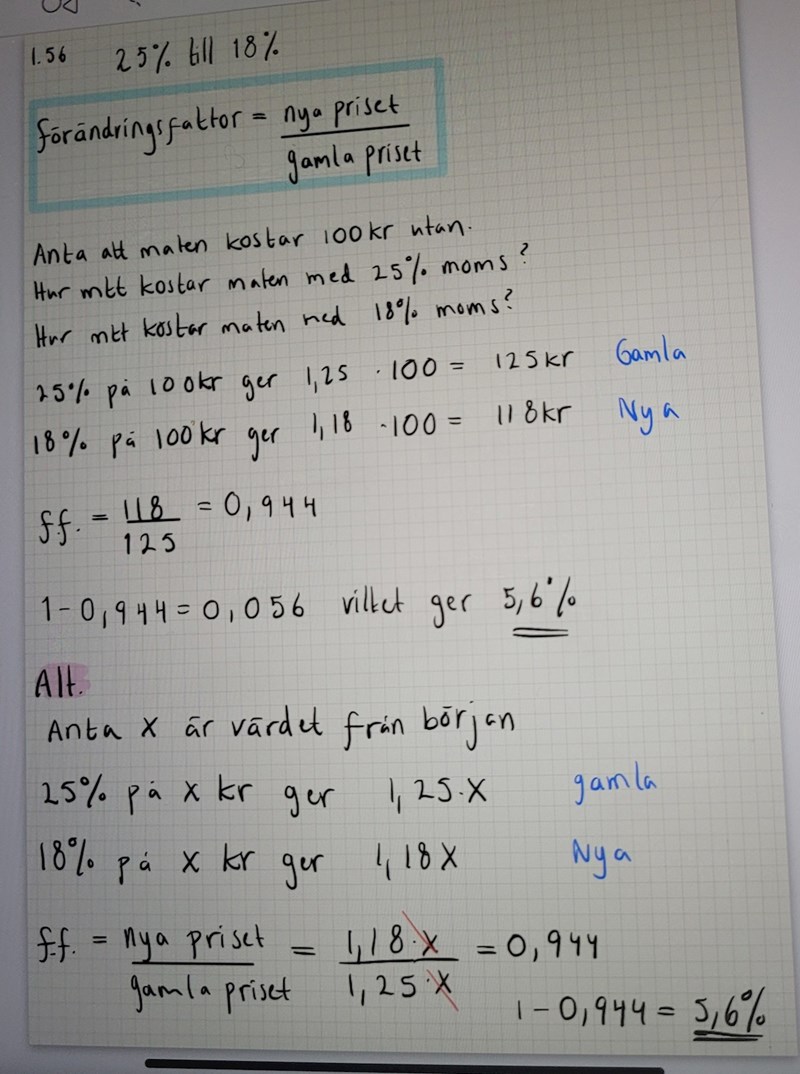 Anta att maten kostar 100 kr utan moms. Hur mycket kostar maten med 25 % moms? Vad kostar maten med 18 % moms? Förändringsfaktor = (nya priset)/(gamla priset), gör om till % prissänkning.