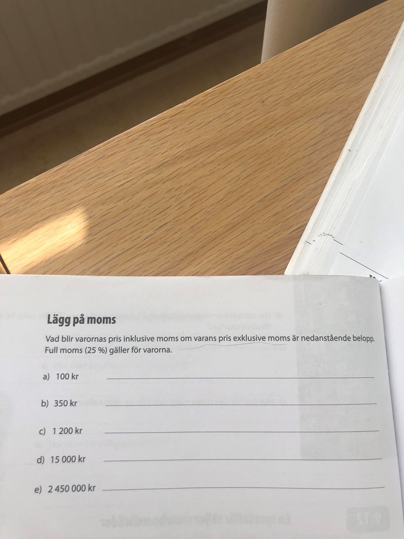 [pris inkl moms] = [pris exkl moms] · 1,25 (om skattesatsen är 25%)Är det rätt i facit på de följande uppgifterna?