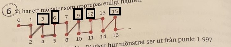 Jag noterar att de punkter som utgör övre hörnpunkter i det som ser ut som någon slags "öppen låda" alla är delbara med 3. Den som är i det högra hörnet av "öppna lådan" är dessutom delbara med 2 (jämna tal)
