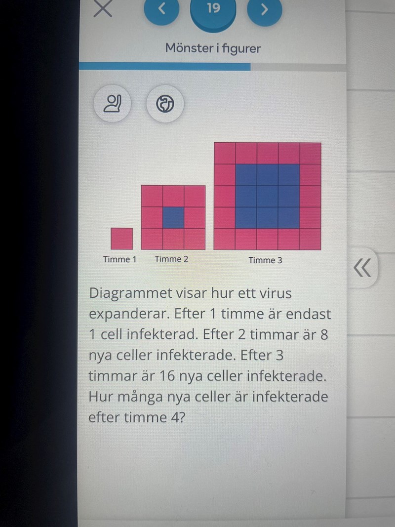 Diagrammet visar hur ett virus expanderar. Efter 1 timme är endast 1 cell infekterad. Efter 2 timmar är 8 nya celler infekterade. Efter 3 timmar är 16 nya celler infekterade. Hur många celler är infekterade efter timme 4?
