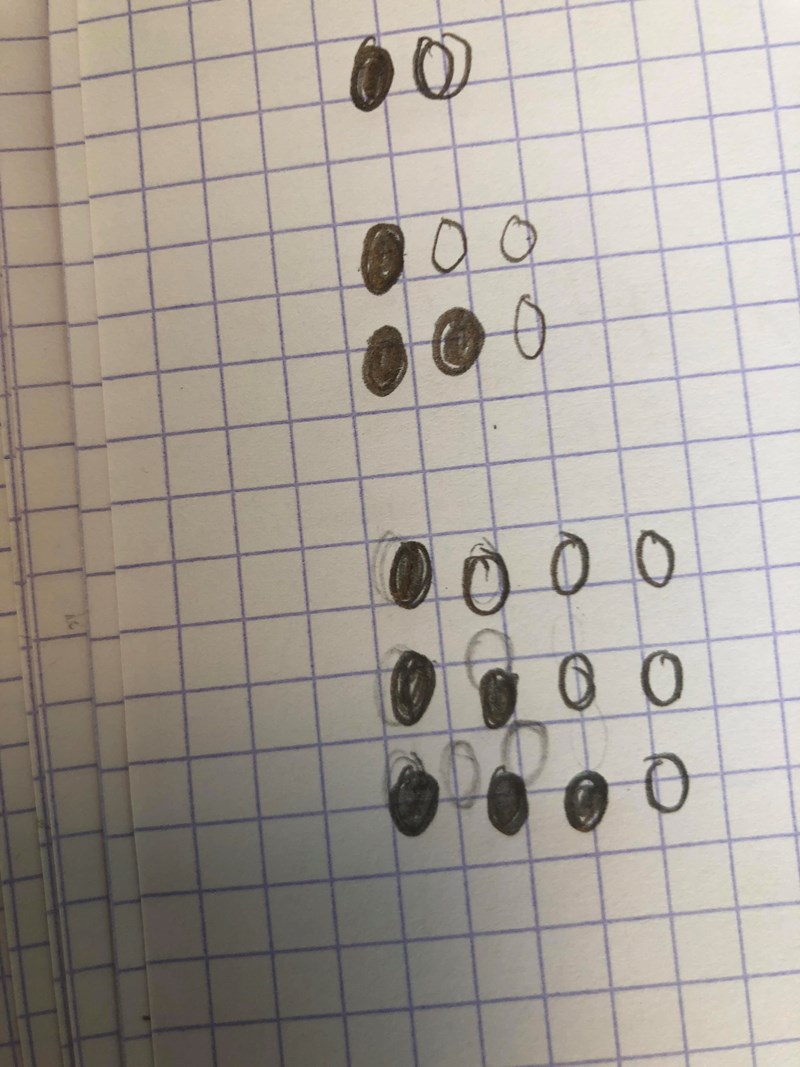 visst ska ma lägga till lika många prickar och därefter dividera på 2.
