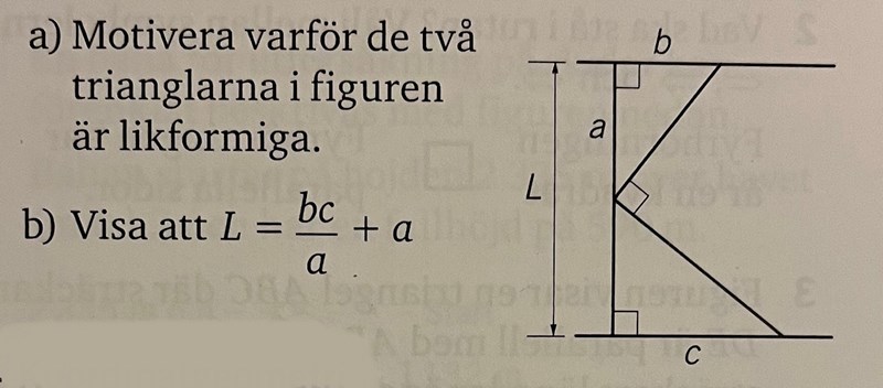 Jag håller på med denna uppgift som du kan se nedan (just nu håller jag på med a) uppgiften). Det jag vet hittills är att trianglarna måste ha två lika stora vinklar för att de ska vara likformiga. Båda dem har ju en 90 graders vinkel, så hittills har jag hittat att dem har en likadan vinkel, men jag hittar inte den andra. Hur ska jag göra för att hitta den?