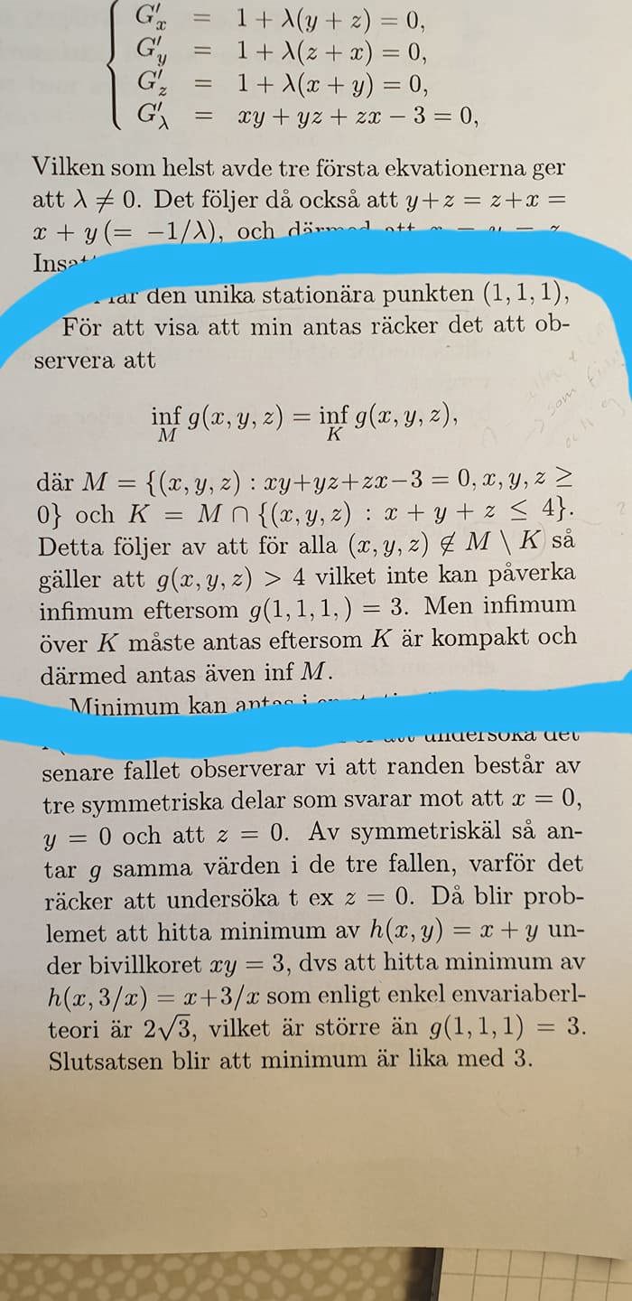 Micimacko skrev:Det jag tror de vill ha sagt är att om ett område är kompakt, alltså har ändliga gränser, så måste ett minsta värde finnas. Brukar finnas en sats om det i boken. Så de klipper bort delar av hela området där de visat att värdet är större, och då blir det kvar ett kompakt område där minsta värde finns.
