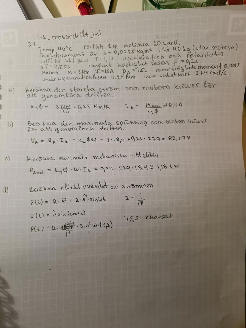 En motor men märkmomentet 3Nm, märkströmmen 13A, RA=1Ω och rotortröghetsmomentet 0.0013kgm2  är vald för att utföra uppgiften. Med denna motor blir momentet under accelerationsfasen 4.24Nm. Maximala vinkelhastigheten blir 279 rad/s.