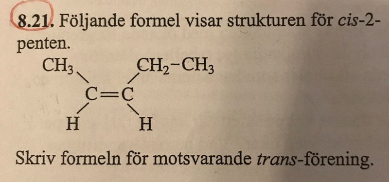 Hej min uppgift lyder såhär och jag undrar om jag har tänkt rätt. Jag tror att motsvarande trans-förening är när man byter plats på vätet och CH2-CH3. Tänker jag rätt?