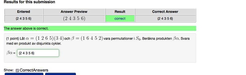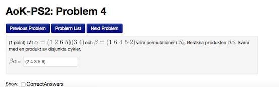 Men nu måste jag bumpa den här frågan, Jag följer SvanteR och kollar då första elementet i är 1, och 1 i går till 2. 2 i går till 1. Så då är den cykeln stängd. Dvs (1 2) är första cykeln. Då kollar vi andra elementet i som är 6. 6 i går till 1. Alltså är den cykeln stängd nu också dvs (6 2) .. Men sen så kollar vi =4 som inte finns i så då är den också stängd? dvs (4) samma sak med 5.. Alltså