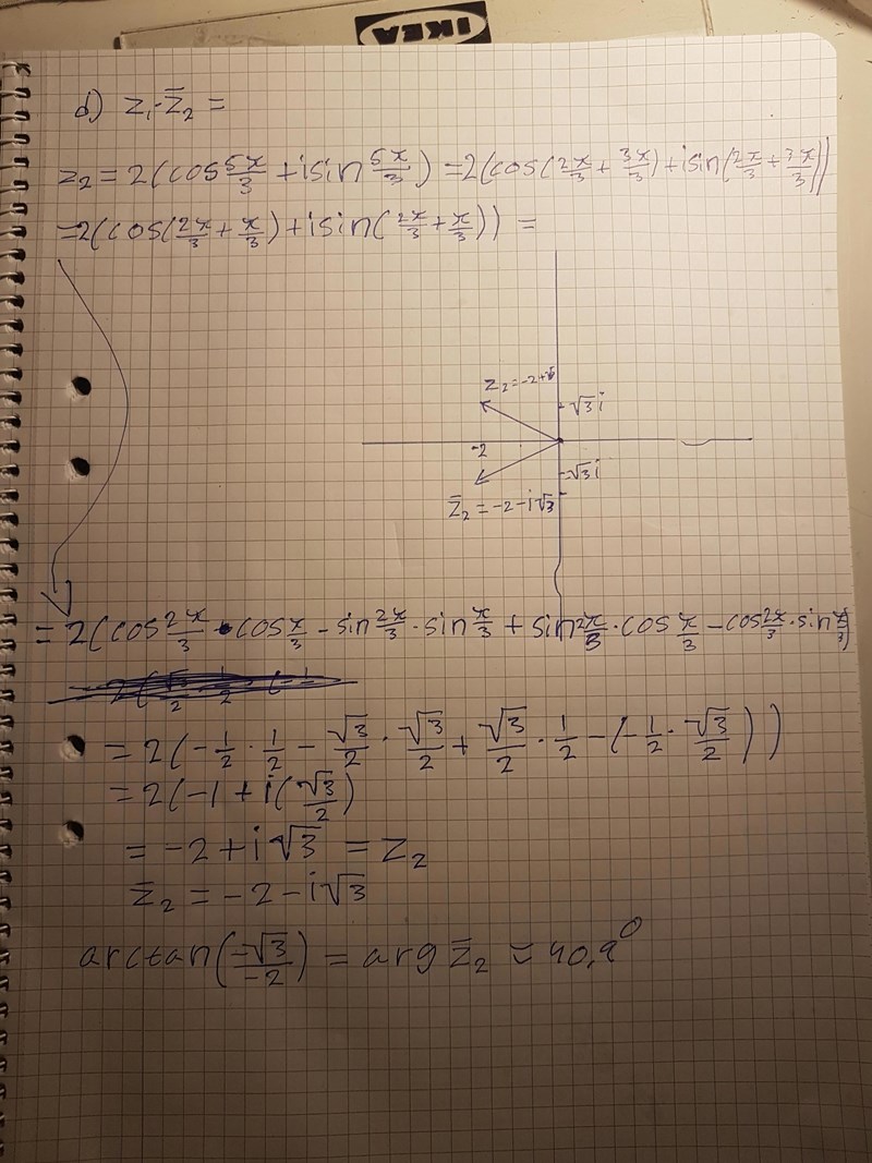När jag härlede ett komplext tal * ett konjugat fick jag fram följande: r_1*r_2(cos(u + v) + isin(u - v)). Då blir svaret till d) 2(cos 23π\12 + isin 17π/12), vilket är fel enligt facit som konstaterar 2(cos 17π/12 - isin 17π/12).