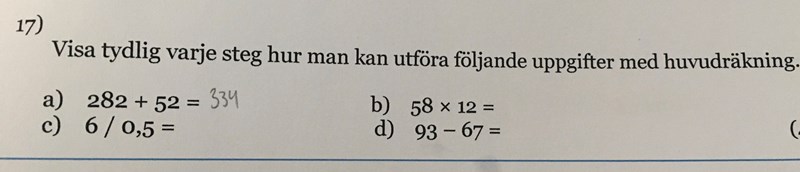 Hej alla! Jag har en uppgift som jag tycker är svår att tyda + räkna ut, den syns på bilden (det är b) med multiplikation). Först undrar jag hur ni tolkar "huvudräkning"? Multiplikation är ju svårt som det är, sen att visa hur man har räknat ut det i huvudet hur ska det gå till? Är det inte okej att göra en vanlig uträkning då?