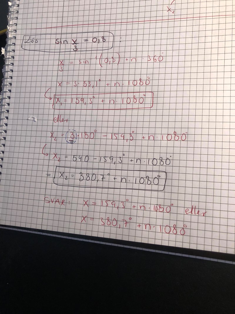 Den andra lösningen: x/3 = 180-159,3+ n360 . Varför inte förenkla 180-159,3=20,7 INNAN du multiplicerar upp 3:an?
