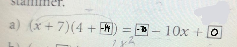 28 har du fått fram. Det vi redan vet om x-termer i vänsterledet är x*4 och till höger står det -10x. Då behöver vänsterrutan bidra med -14x när den har multiplicerats med 7.