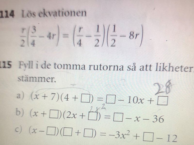 - Detta ska vara lika med det som står till höger. Till höger finns endast en -term, nämligen . Denna term ska vara lika stor som -termen till vänster, dvs . Det ger dig ekvationen .
