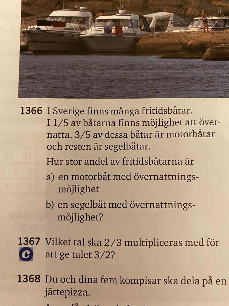 Kan det hjälpa att rita? Rita en stor rektangel. Den motsvarar alla fritidsbåtarna. Färglägg en femtedel. Det är båtarna man kan övernatta i. Om det t.ex. skulle finnas 800000 båtar i Sverige så blir fritidsbåtar. Markera sen av den färglagda delen, d.v.s. de övernattningsbara motorbåtarna. Då blir det