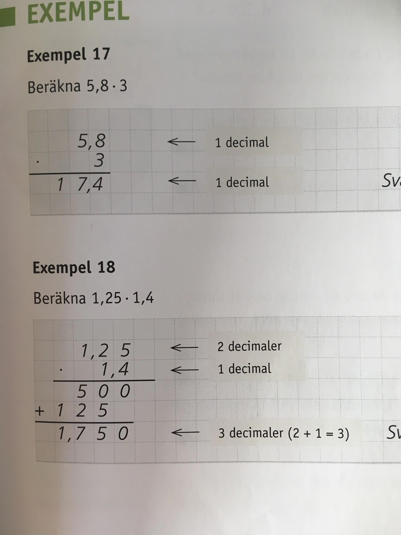 Jag förstår multiplikation 5,8*3 men inte den andra. Jag tycker inte boken förklarar ordentligt . Kan någon förklara hur man ställer upp 1,25*1,4 eller finns det ett annat sätt att räkna ut ?