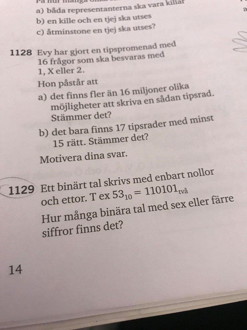 Jag förstår inte hur jag ska tänka. Vilka är ”brev” och vilka ”lådor” här? Jag tänker att jag har två variationer (0 och 1) samt 6 ”platser” som jag kan sätta dessa variationer på. Så därmed får jag 2^6 för antal kombinationer. Fast får jag då med siffror färre än sex? Gäller inte variationerna endast kombinationer av sex siffror?