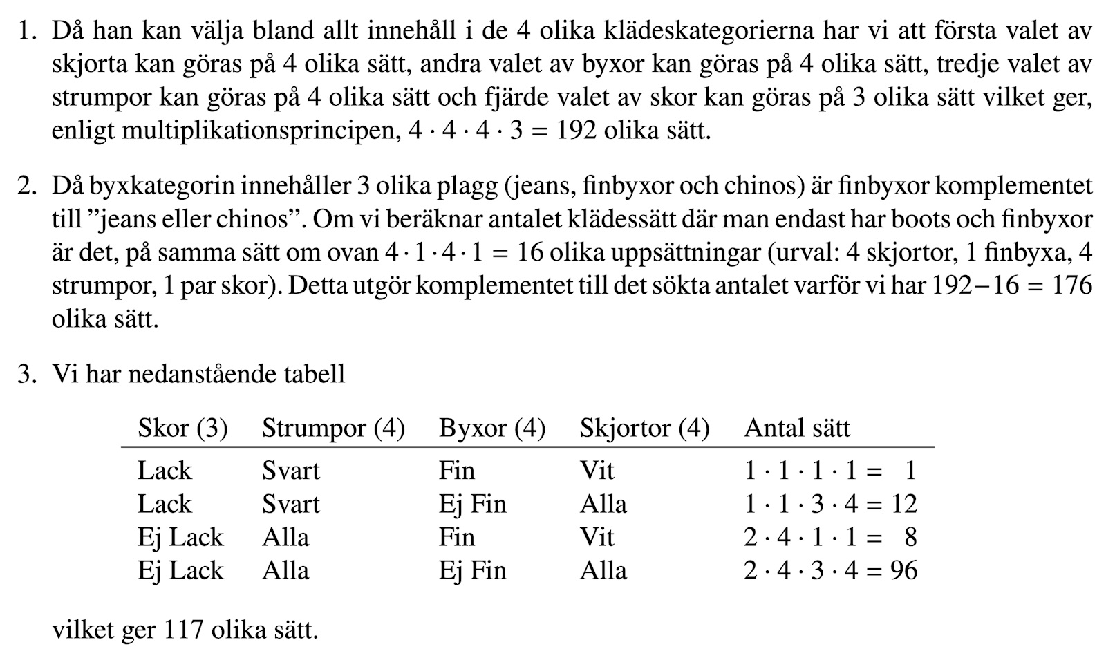på hur många sätt kan han klä sig, om: han bara kan ha svarta strumpor till lackskorna och alltid vit skjorta till finbyxorna?