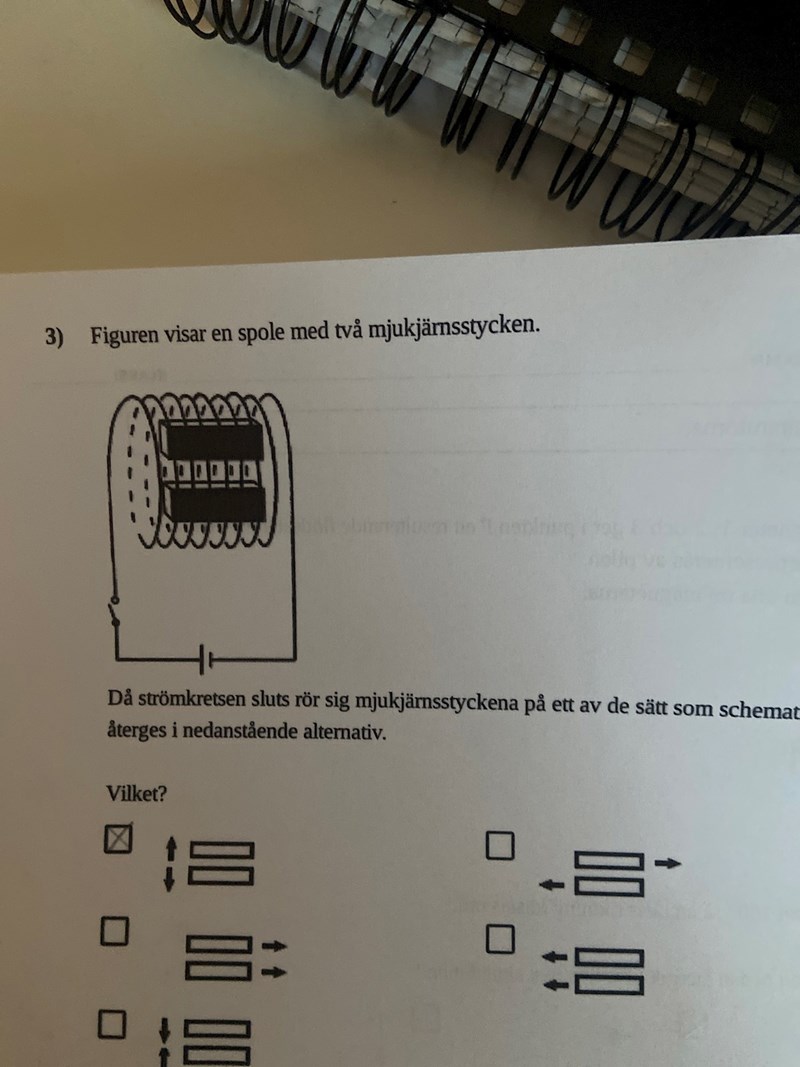 När det flyter ström i spolen så magnetiseras mjukjärnsstyckena. Var hamnar nord och syd-polerna på respektive bit? Vad medför det?