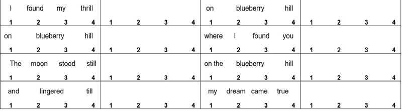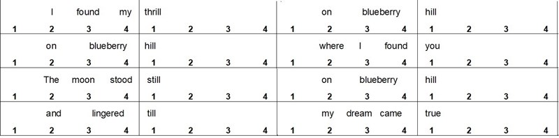 Ytterligare tillägg: När man hittat takten med foten kan man låta ena handen slå mot borsdskivan efter texten för andra och fjärde slaget i takten. Alltså på orden found, thrill, (slag2, slag4) blue, hill osv. Det inom parentes är den ordlösa takten.