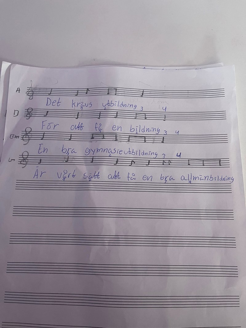 Hej jag behöver verkligen hjälp med en läxa på musiken. Jag har väldigt svårt med ämnet musik och behöver eran hjälp med etta. Jag har en läxa där jag ska skriva en låt med ackord och noter. Jag har gjort det men känns som om jag har gjort fel med noter och ackord. Behöver verkligen hjälp med detta, skulle vara så tacksam om någon kunde hjälpa mig med detta :)