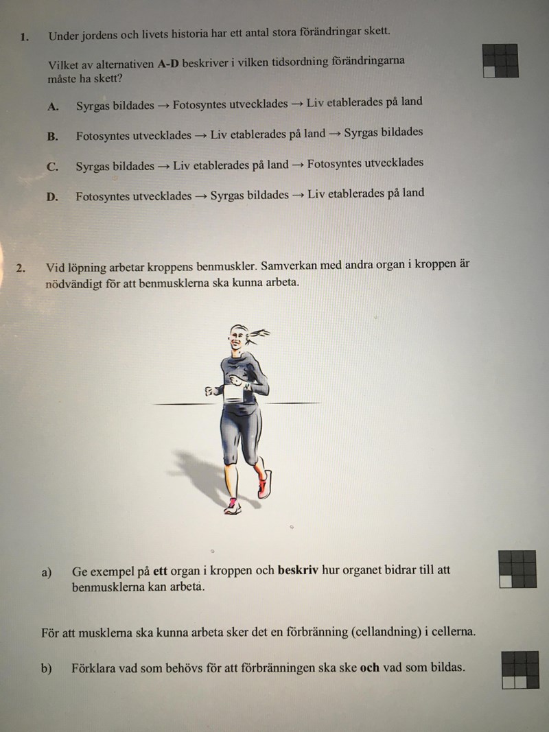 På fråga a skall du ge ett exempel på ett organ som bidrar till att man kan använda sina benmuskler och springa. På fråga b skall du förklara vad som behövs för att förbränningn skall ske och beskriva vilka ämnen som bildas vid cellandningen.