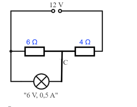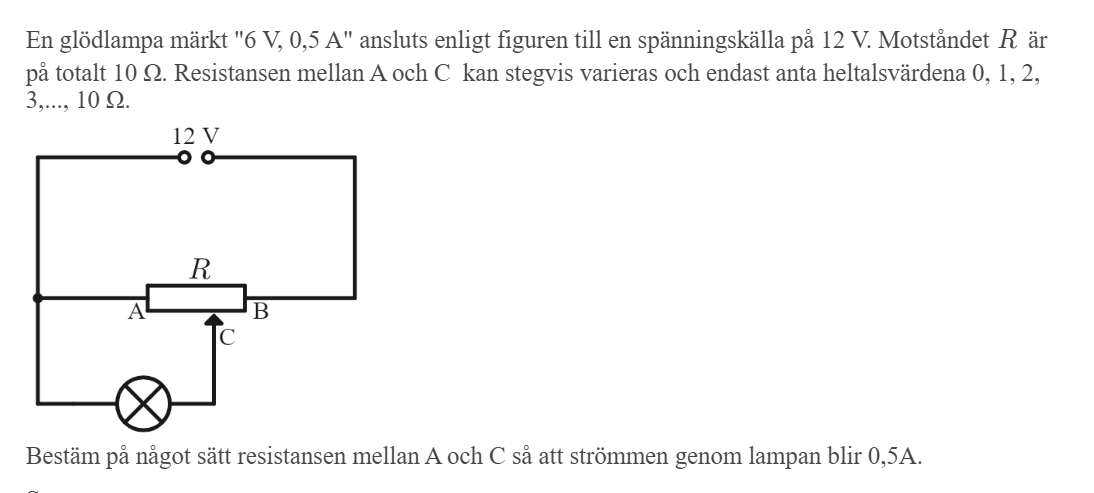 Sätt delresistanserna till x och 10-x. Eftersom lampan skall ha sina nominella värden blir strömmen genom  den 0,5 A och spänningen över den 6 V. Då blir strömmen genom x 6/x A. För höger del blir summaströmmen 0,5 + 6/x och spänningen (10-x)(0,5+6/x)=6.