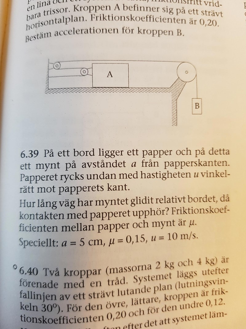 6.39 det gäller. Min tanke var att jag skulle räkna ut hur lång tid som det tog att dra bort pappret från bordet. Och använde då s = vt för att få ut tiden. Sen att jag ska använda det för att räkna ut accelerationen på pappret. Men jag vet inte vad kopplingen mellan accelerationen på pappret är och myntets. Testade använda (mv^2)/2 = F × s men jag har inte m. Så som ni kan förstå så är jag lite lost.