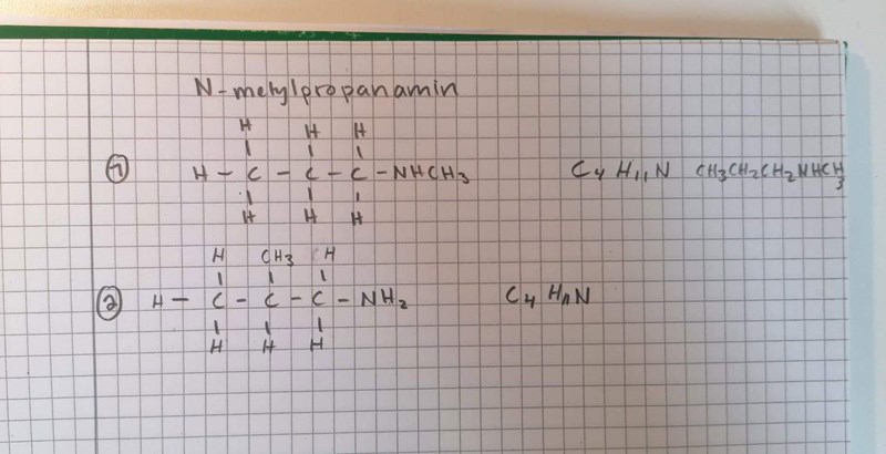 Hej, jag ska rita strukturformeln för N-metylpropanamin och förstår inte riktigt varför den ser ut som den gör. På bilden är nummer ett rätt och inte nummer två.