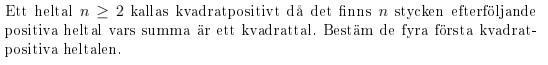 Ett heltal n2 kallas kvadratpositivt då det finns n stycken efterföljande positiva tal vars summa är ett kvadrattal. Bestäm de fyra första kvadratpositiva talen.