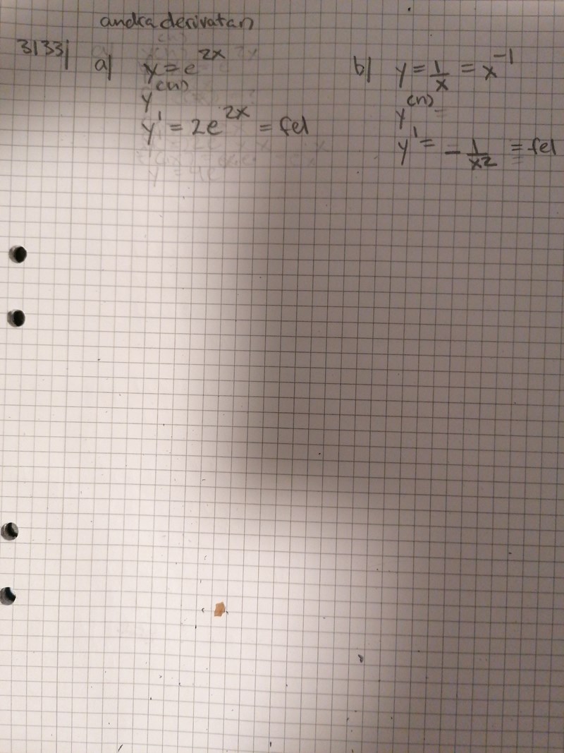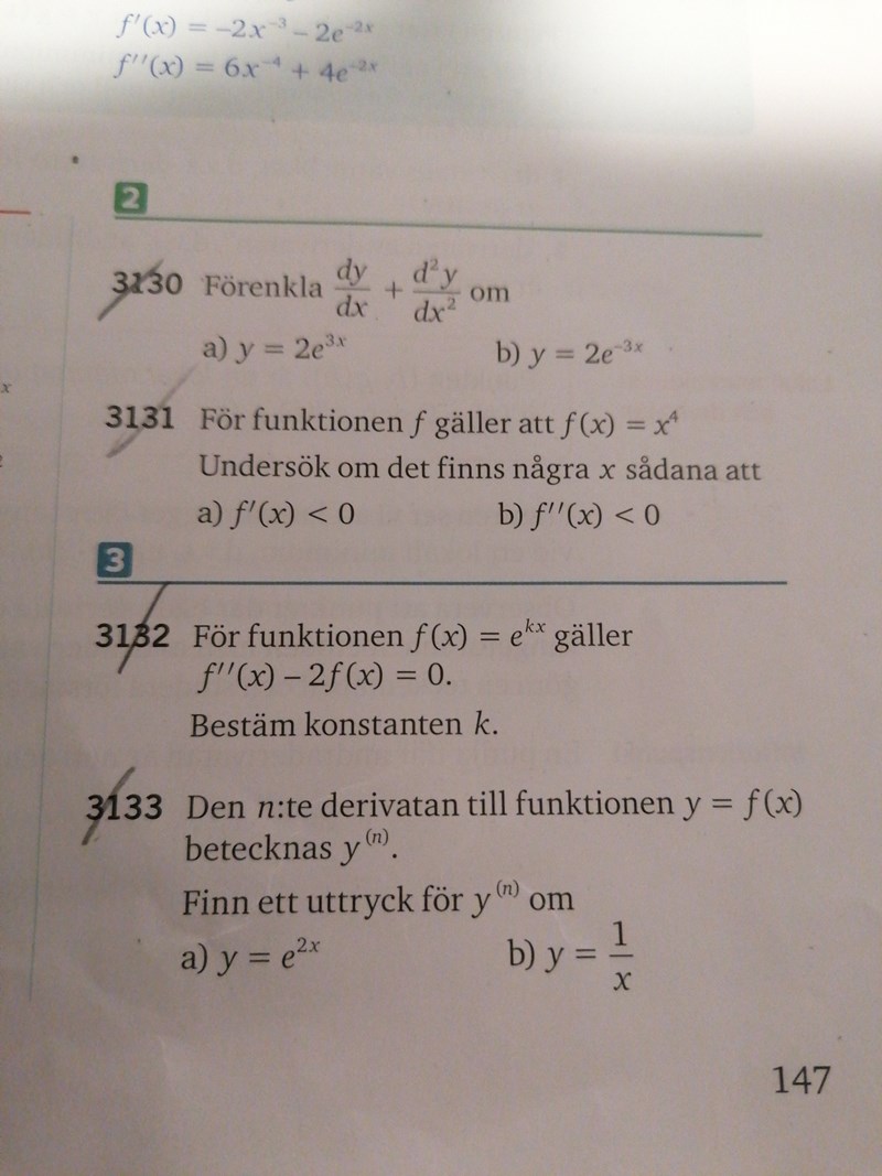 Hej! Kan någon förklara lösningen från facit? Jag misstänker att jag gjort fel på a och b. På a delen där jag svarat med första derivatan av funktionen och jag skulle svarat med den tredje istället. På b delen svarade jag vad den första derivatan var med hjälp av formelbladet och jag skulle svarat med densamma. Jag förstår ej motiveringen.
