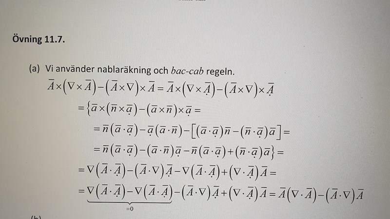 För att komma runt det finns det olika skolor/metoder. Ni tycks använda en prick-notation jag inte sett tidigare. Men prick verkar indikera att vektorn ska nablaseras partiellt samtidigt som andra fält ses som konstanter. Det är helt enkelt ett sätt att hålla ordningen på vilket fält som ska påverkas av nabla, allt annat kan vi gå rakt igenom.