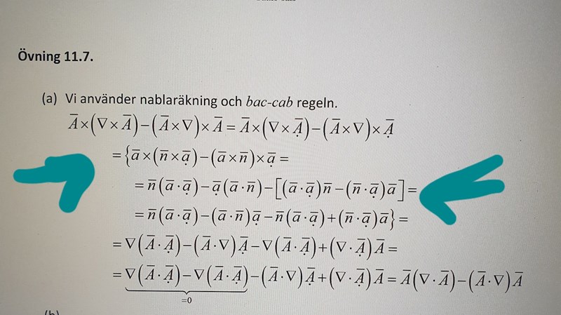 I ditt exempel har man bara bytt tillbaka från n¯\overline{n} till \nabla och sedan samlat ihop termerna. Det viktiga är att man när man tar bort prickarna fortfarande har fältet som ska deriveras till höger, så nabla har något att verka på.