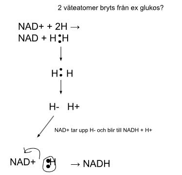 I sista steget har jag svårt att se hur H:ets elektroner ''hoppar över'' till NAD+ skal (?) & sen hur NAD & H:et binds ihop sen (så att NADH bildas). Hänger en proton med när detta H binder till NAD+?