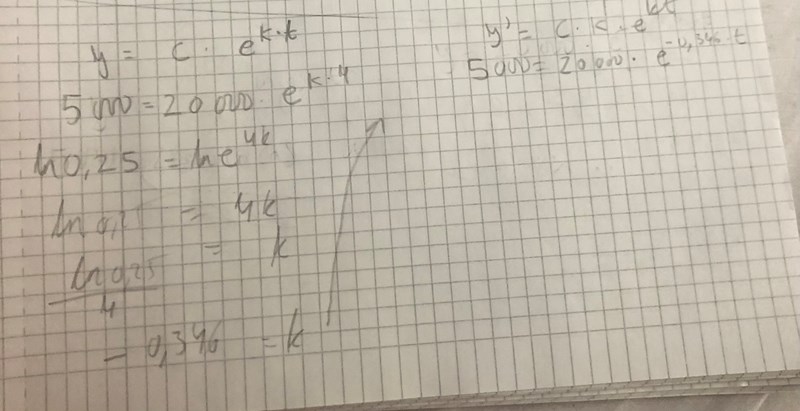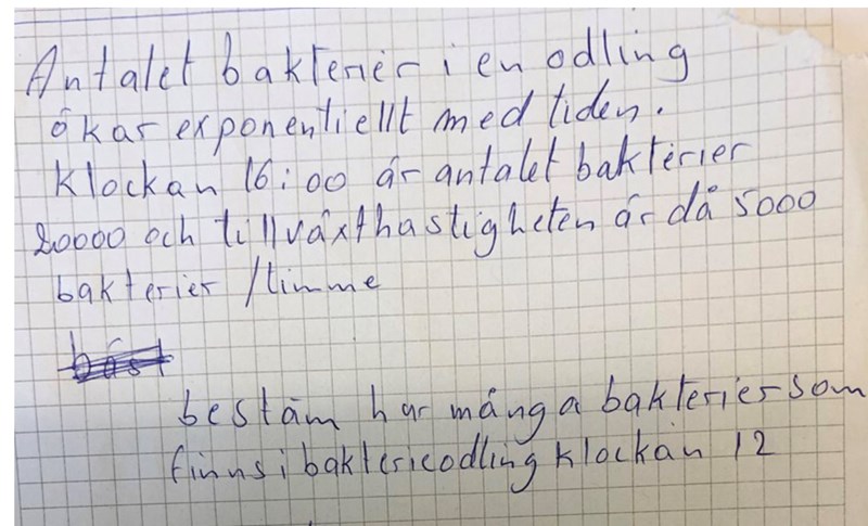 När nånting växer exponentiellt kan detta beskrivas med ekvationen y (t)= C.ekt där (i det här fallet) y är antalet bakterier vid tiden t, C är antalet bakterier från början (klockan 12:00) och k är en konstant.