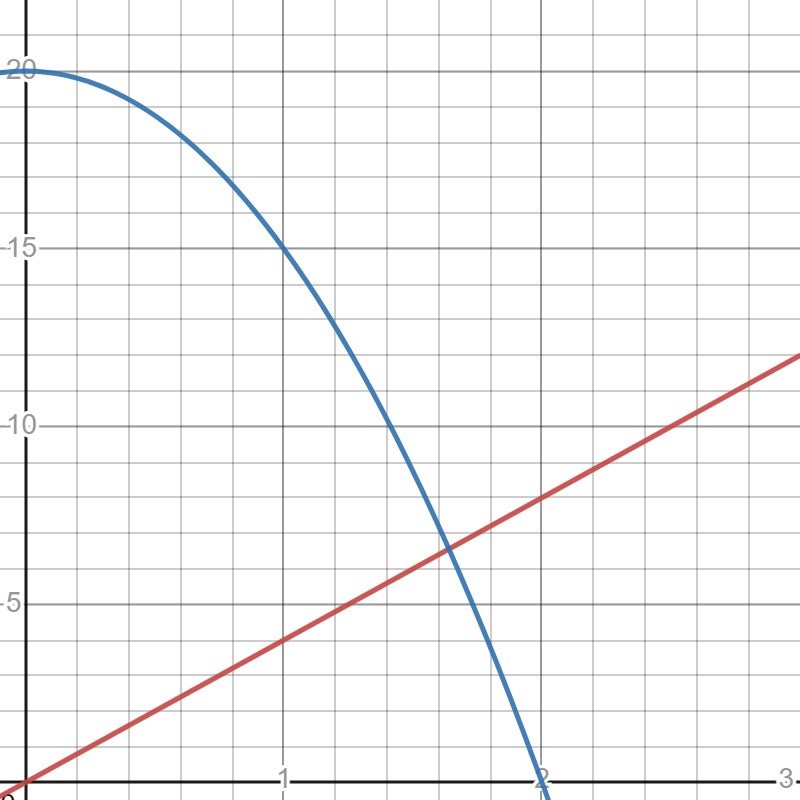 Kaströrelser i tre olika fall beskrivs av att x - och y-koordinaterna varierar med tiden enligt a) x = 4t , y = 20 − 5t2 b) x = 0 , y = 10t – 5t2c) x = 5t , y = 2t – 5t2Här är x och y angivna i meter, tiden t i sekunder, och x-axeln ligger utefter marken. Bestäm för respektive fall i startpunkten (t = 0) hastigheten i x-led och y-led samt hastighetens storlek och hur stor vinkel hastigheten bildar med x-axeln. Är det frågan om vertikalt kast, horisontellt kast, eller snett kast? Tips: Hastigheten vid en viss tidpunkt, momentanhastigheten, i x- respektive y-led kanbestämmas genom att först bestämma derivatan av respektive koordinat med avseende på t och sedan sätta in värdet på t.