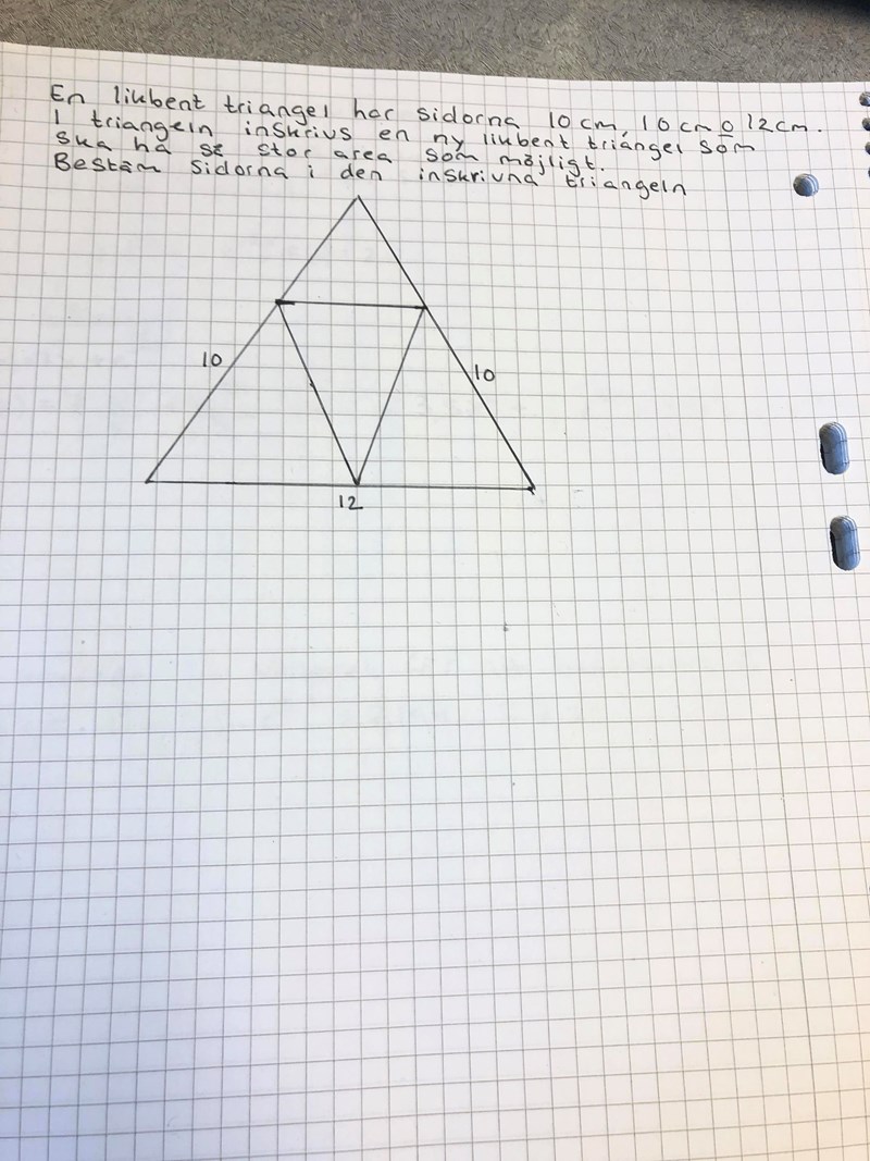 Rita in några olika, likbenta trianglar inuti den stora triangeln. Vilken av dem har störst area - en som är hög och smal eller en som är låg och bred? Hittar du några likformiga trianglar du kan ha nytta av?