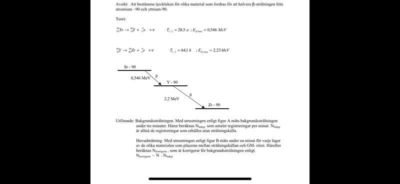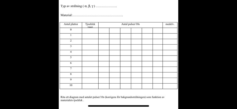 Preparatet som användes var Cs-137 och strålningen var gammastrålning, båda ska stå med i förklaringen under diagrammet och över tabellen, men vet inte riktigt hur jag ska formulera mig?