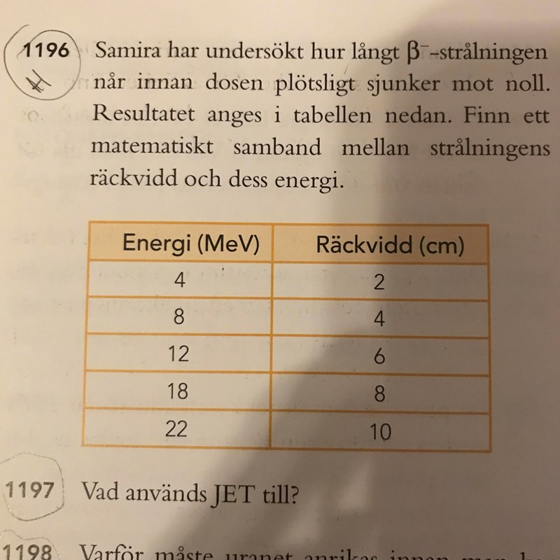 Samira vill veta hur långt strålningen når, beroende på energin. Vilken variabel är beroende, respektive beroende?